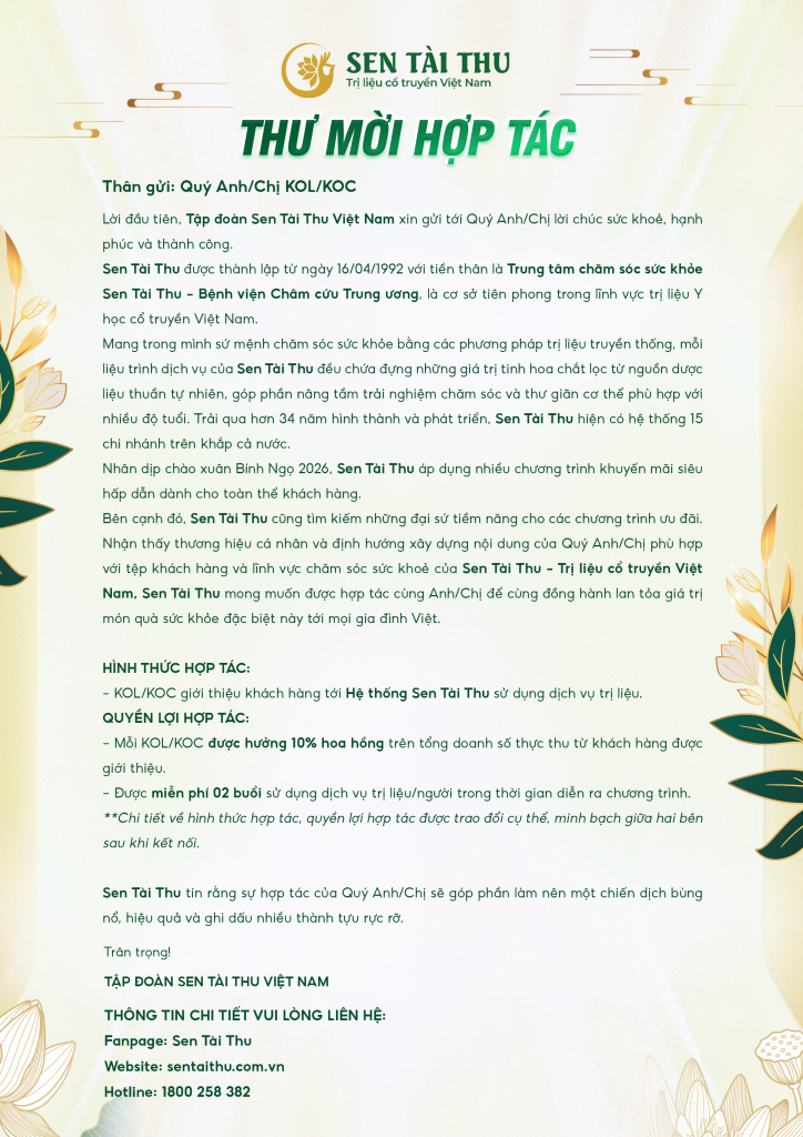 Hệ thống Sen Tài Thu – Trị liệu cổ truyền Việt Nam chính thức tìm kiếm đại sứ hợp tác cho các chương trình ưu đãi chào Xuân Bính Ngọ 2026.